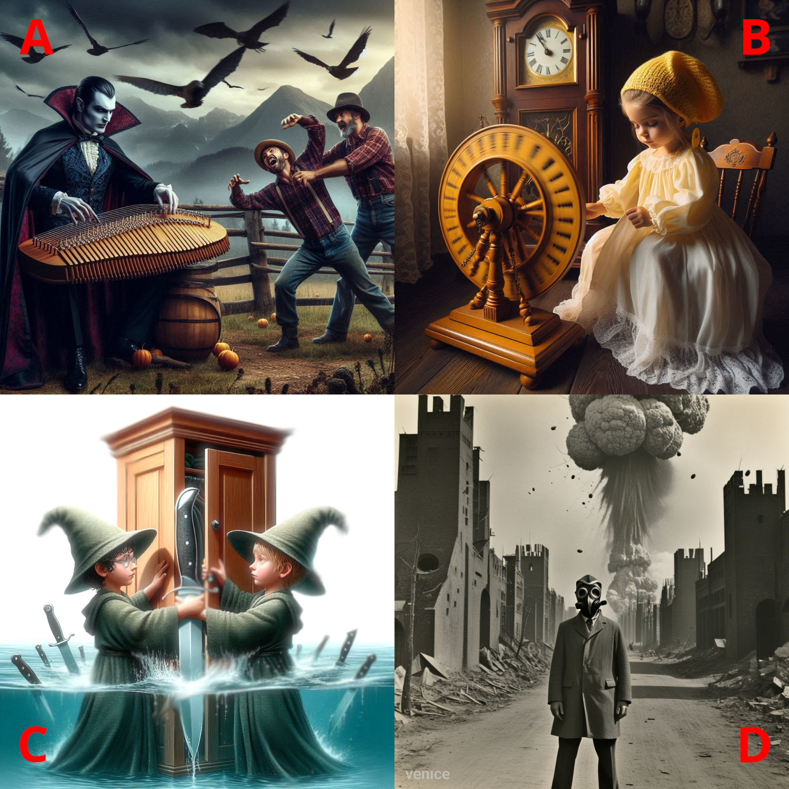 Obrazek D jest zadaniem dla chętnych. Kilka komercyjnych sztucznych inteligencji odrzuciło moje prompty, a być może przesłało też moje namiary do FBI i CIA... a już na pewno do MOSSADU! Skojarzenia są to tylko trzy... jakby chciało się Państwu liczyć -- budowli na obrazku jest siedem...