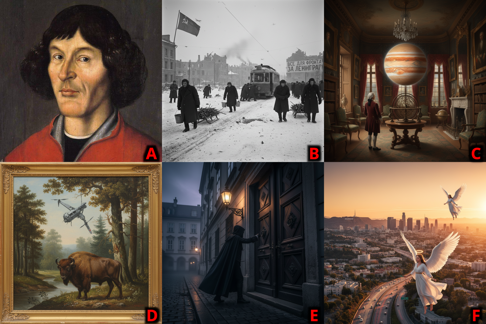No i jest sześć symfonii -- ukrywających się pod literkami A do F – których tytuły lub nazwy zwyczajowe należy odgadnąć. W ramach podpowiedzi – z jakiegoś powodu nie zmieściła się na liście symfonia Louisa Glassa, z „wedyjskim solarnym symbolem szczęścia” w tytule (AI odmówiło rysowania, nie wiadomo czemu) ani żadna kompozycja Josepha Haydna (nie mogliśmy się zdecydować na którąś z ponad 100…).