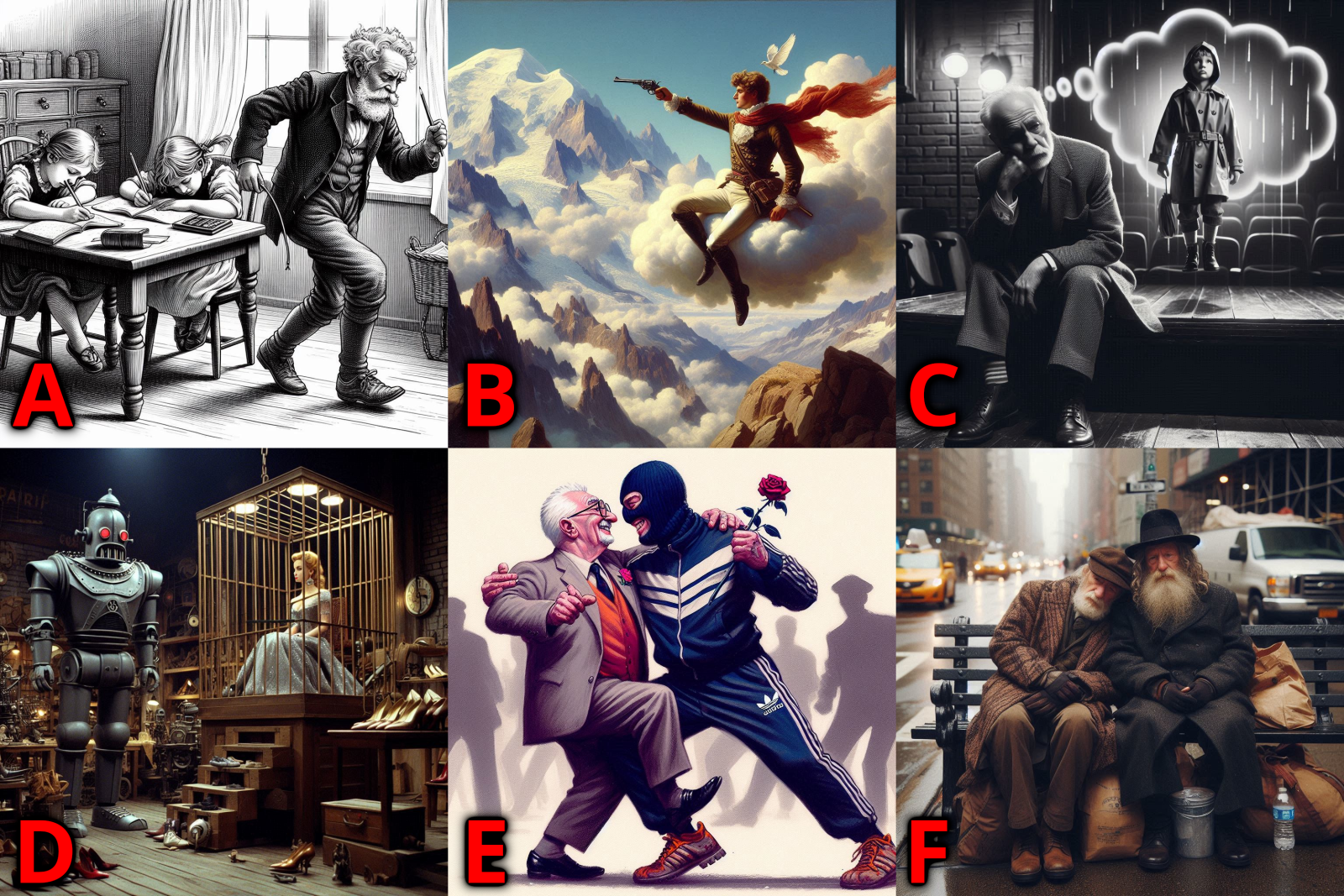 Dzisiejsza zagadka lateralna powstała - a jakże! - we współpracy ze sztuczną inteligencją. Tym razem wysłaliśmy sztuczną inteligencję do teatru... Na razie w charakterze widza.  AI zapoznała się z sześcioma sztukami scenicznymi, wyłącznie polskich autorów! Do każdej z nich przygotowała lateralną ilustrację. Ile z tego zrozumiała, tyle Państwo Szanowne widzą na załączonym obrazku. A zagadka jak zwykle - banalnie prosta! Trzeba tylko odgadnąć tytuł sztuki oraz jej autora. No i może jeszcze, co takiego sztuczna inteligencja uchwyciła na obrazku.